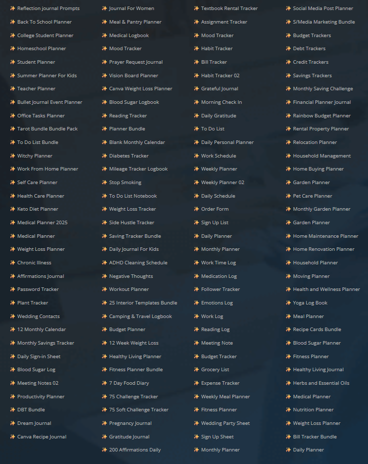 - Planners (Daily, Weekly, Monthly, Fitness, Financial, etc.)