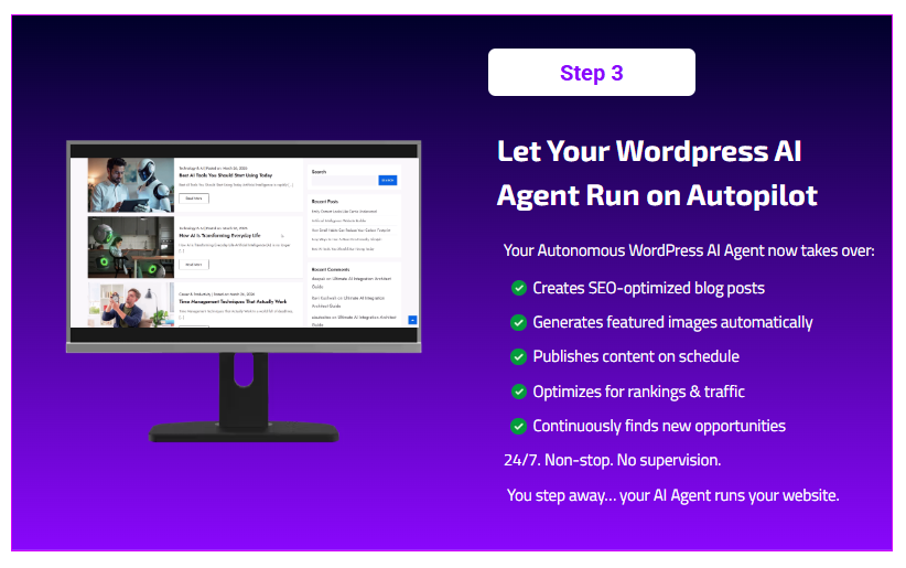 Instead of doing everything yourself, the system introduces what it calls an AI WordPress Agent—a workflow that continuously: