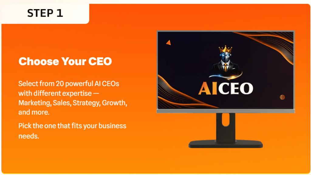 Choose from 20 different AI CEOs specializing in areas like marketing, sales, growth, and corporate strategy. No technical skills are required—just select a CEO that fits your needs.