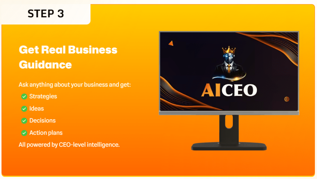 AI CEO shifts from manual guesswork and fragmented advice to an automated, AI-powered system. The automation brings speed, consistency, and accuracy to business strategy, freeing owners from overwhelm.