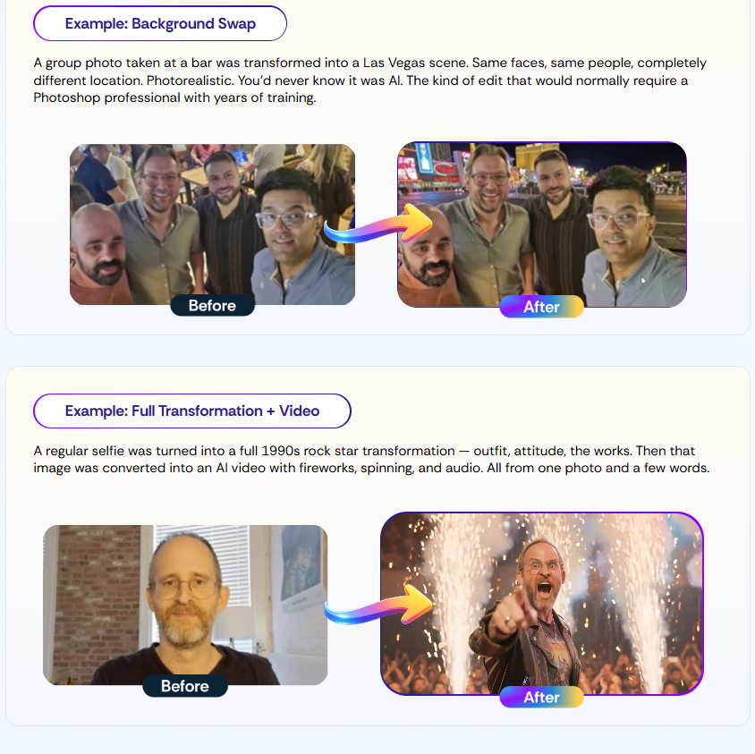 - Change backgrounds, outfits, lighting, and objects