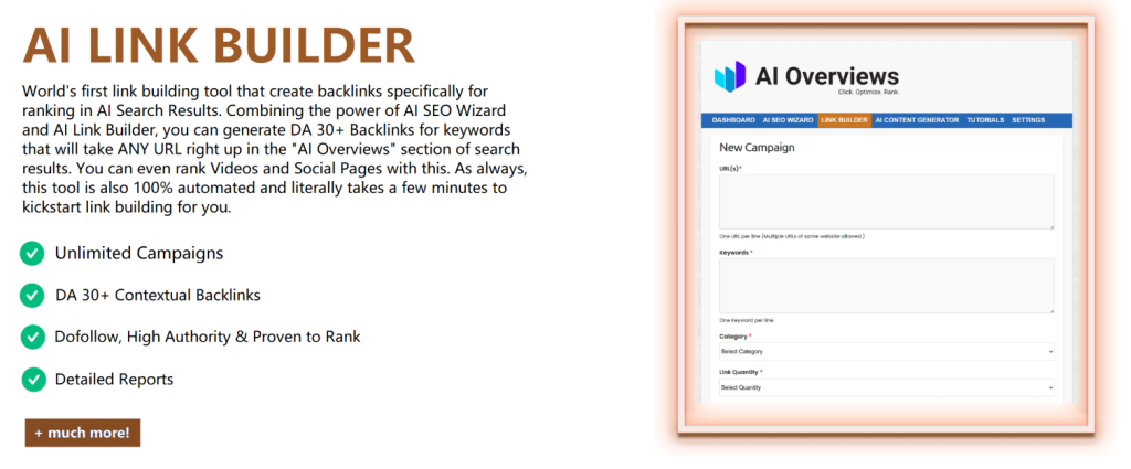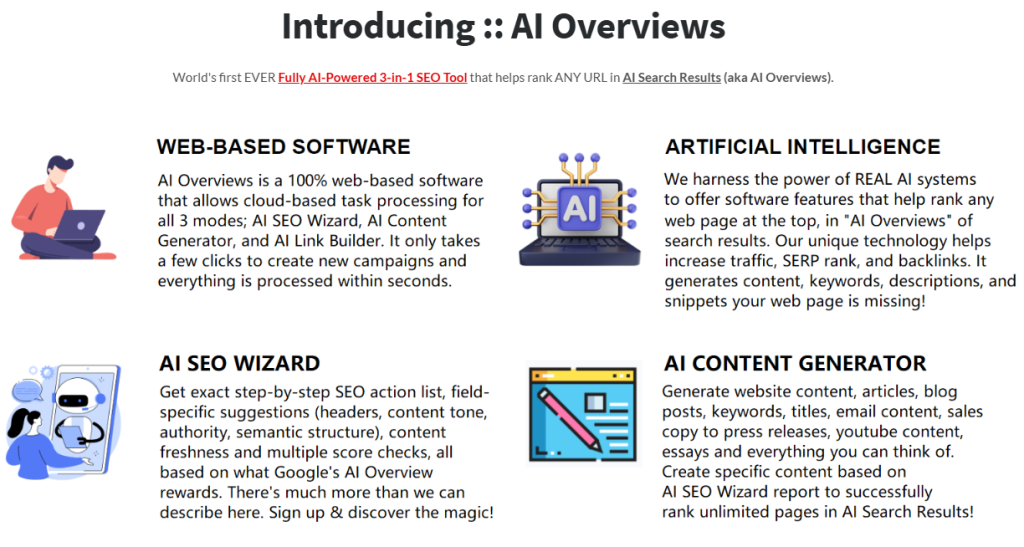 - What is AI Overviews? It’s an all-in-one SEO platform that helps optimize your site specifically for AI-powered search results through content, backlinks, and automation.