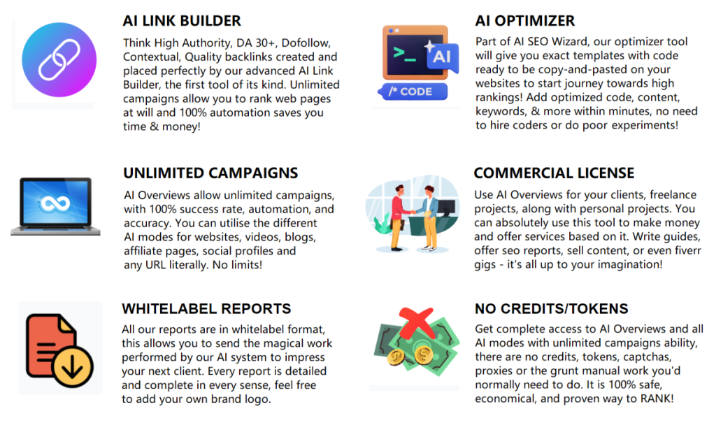 AI Overviews emerges as a comprehensive platform designed to optimize your content specifically for AI-powered search results, generate high-quality SEO content, build authoritative backlinks, and automate traffic campaigns—all without any technical skills required.