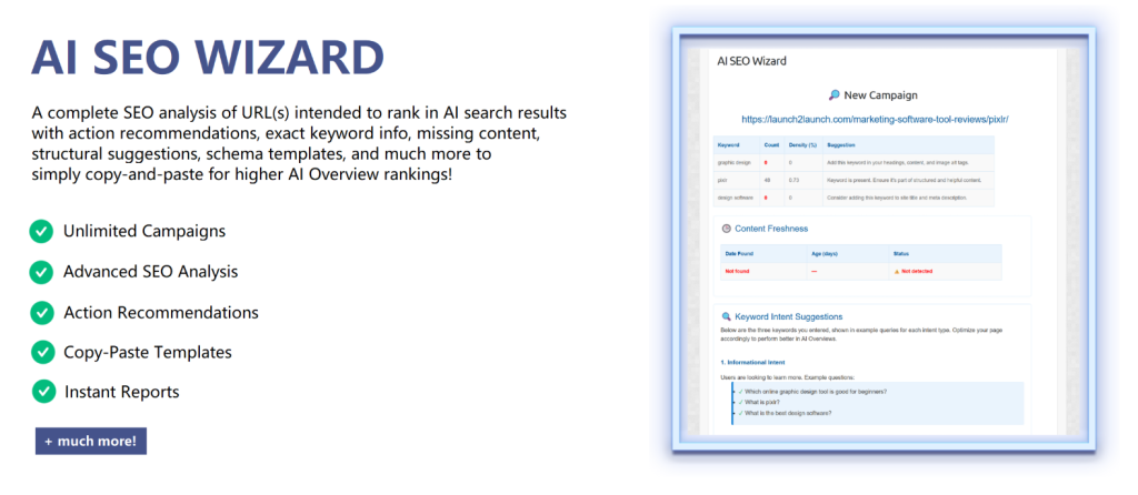 - AI SEO Wizard: Delivers tailored optimization suggestions that improve rankings in AI-driven search results, making your content more relevant and visible.