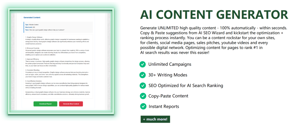It combines AI-driven content optimization, automated backlink building, and SEO campaign automation into one cohesive toolkit aimed at boosting website visibility and free targeted traffic.