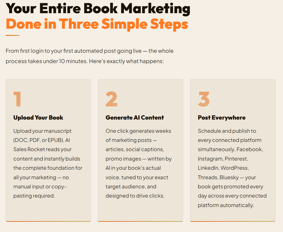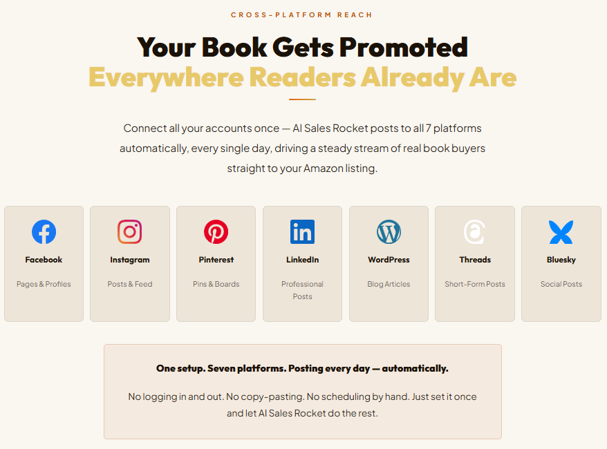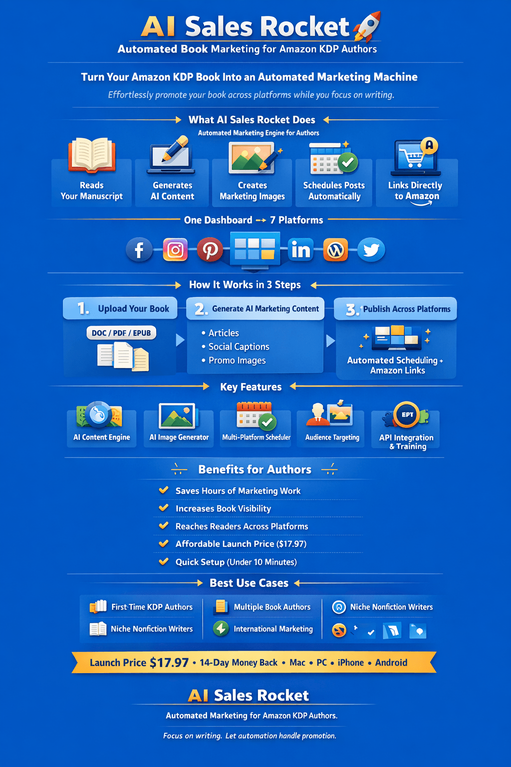 AI Sales Rocket is an automated marketing platform designed specifically for Amazon KDP authors. It reads your uploaded manuscript, generates marketing-ready content in your book’s voice, creates platform-optimized images, and schedules posts across seven platforms — all with the goal of driving real buyer traffic to your Amazon listing while you focus on writing.