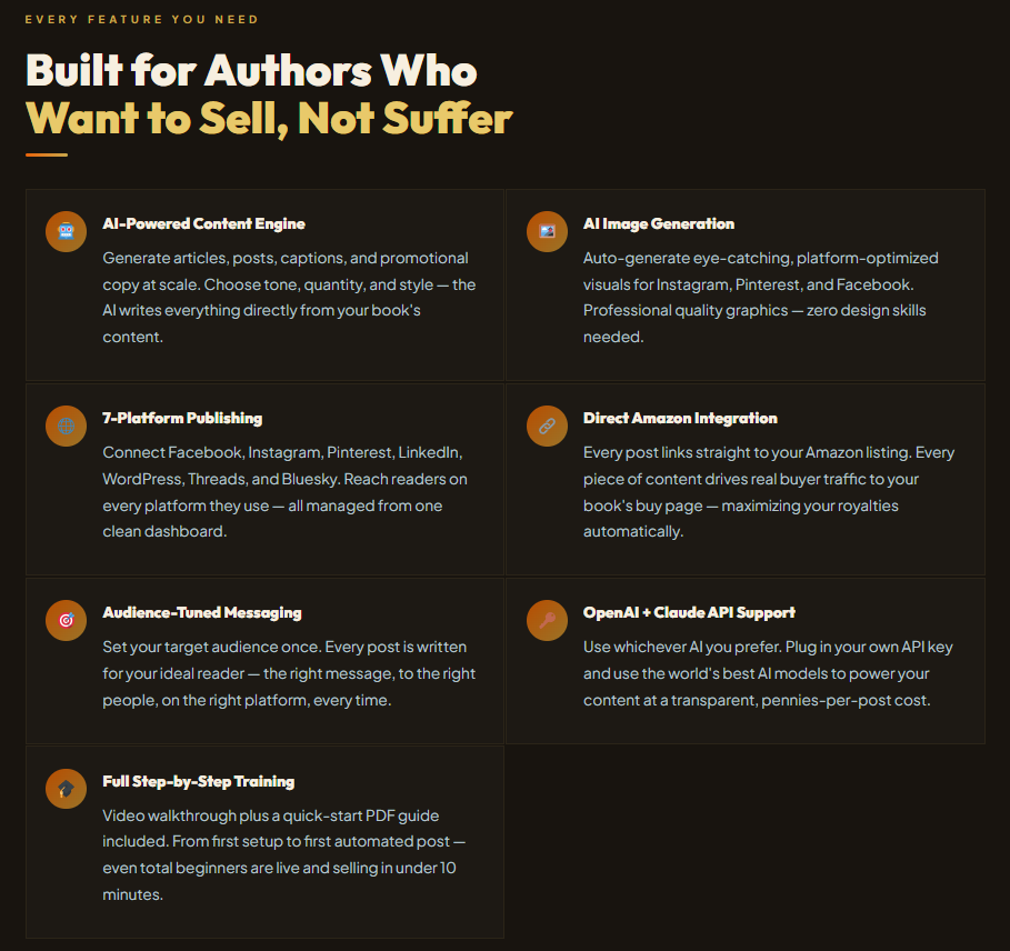- AI-Powered Content Engine: Generates articles, captions, and promotional copy straight from your manuscript.