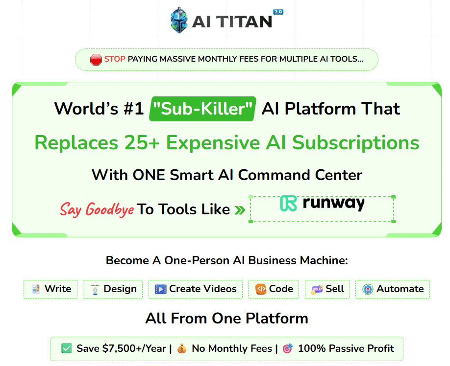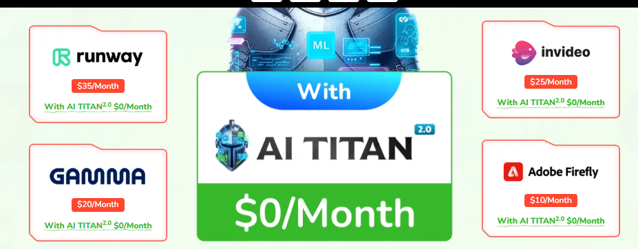 AI Titan 2.0 is a breakthrough in AI-powered business tools, combining the power of over 25 individual AI platforms into one highly accessible, affordable, and automated solution. It eliminates the complexity and heavy costs of managing multiple subscriptions, while giving you robust tools to create content, design, market, and sell like a pro.