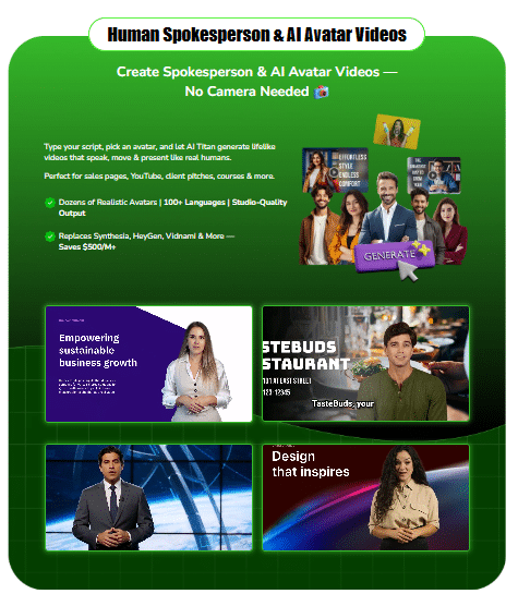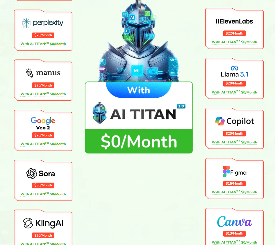- Other Tools: Instead of spending $500+ per month on multiple subscriptions (ChatGPT, Canva, MidJourney, Synthesia, ElevenLabs, etc.), AI Titan replaces them all for a one-time fee.