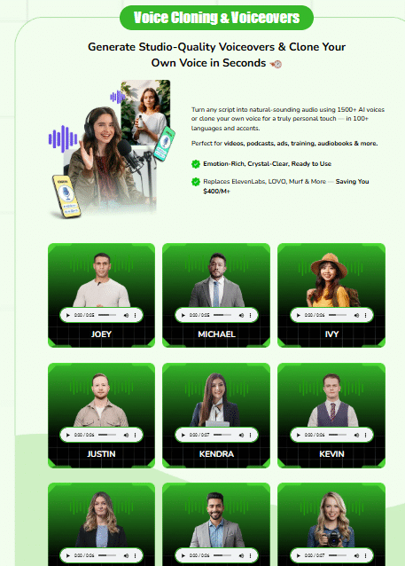 - Voice cloning and voiceovers in 100+ languages and accents