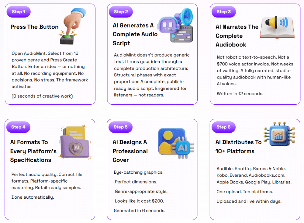 What it is: AudioMint is the world’s first fully autonomous AI audiobook publishing platform that creates, narrates, formats, and auto-publishes audiobooks to multiple major platforms simultaneously.