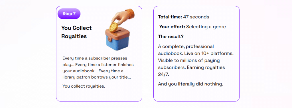 Allows you to create audiobooks for clients and charge premium fees, creating an additional revenue stream beyond royalties — all performed within the same automated platform.