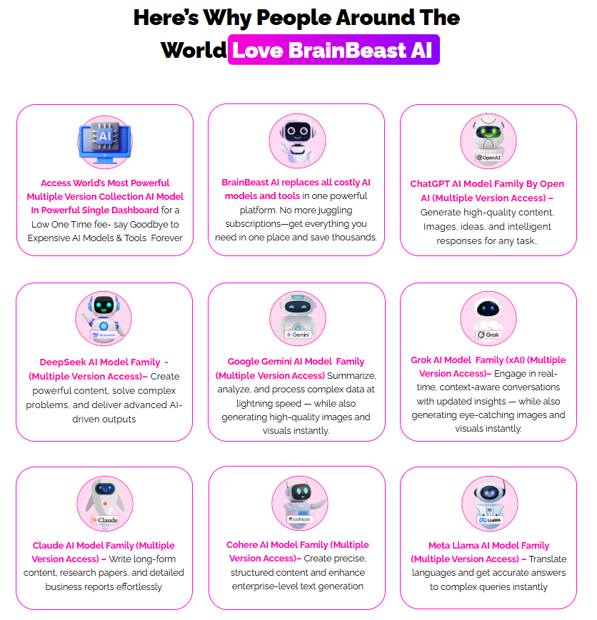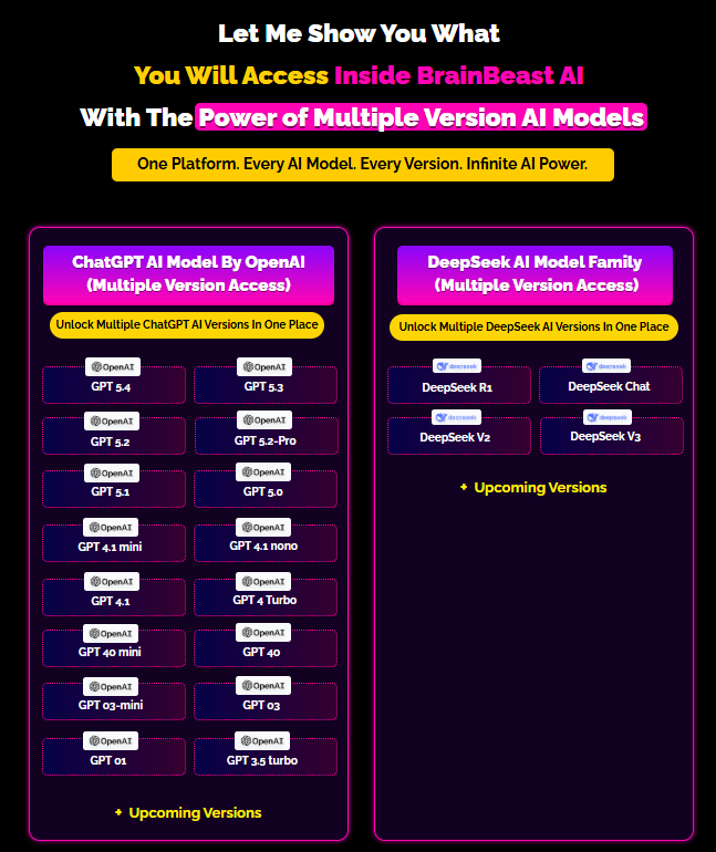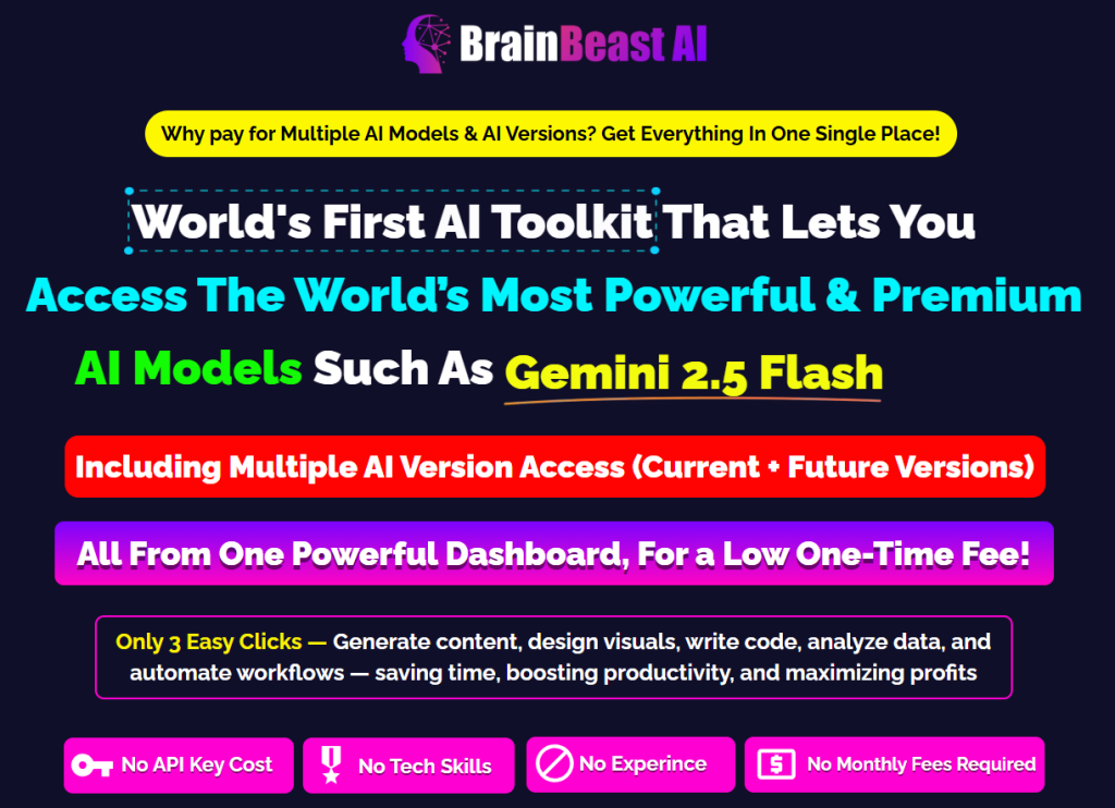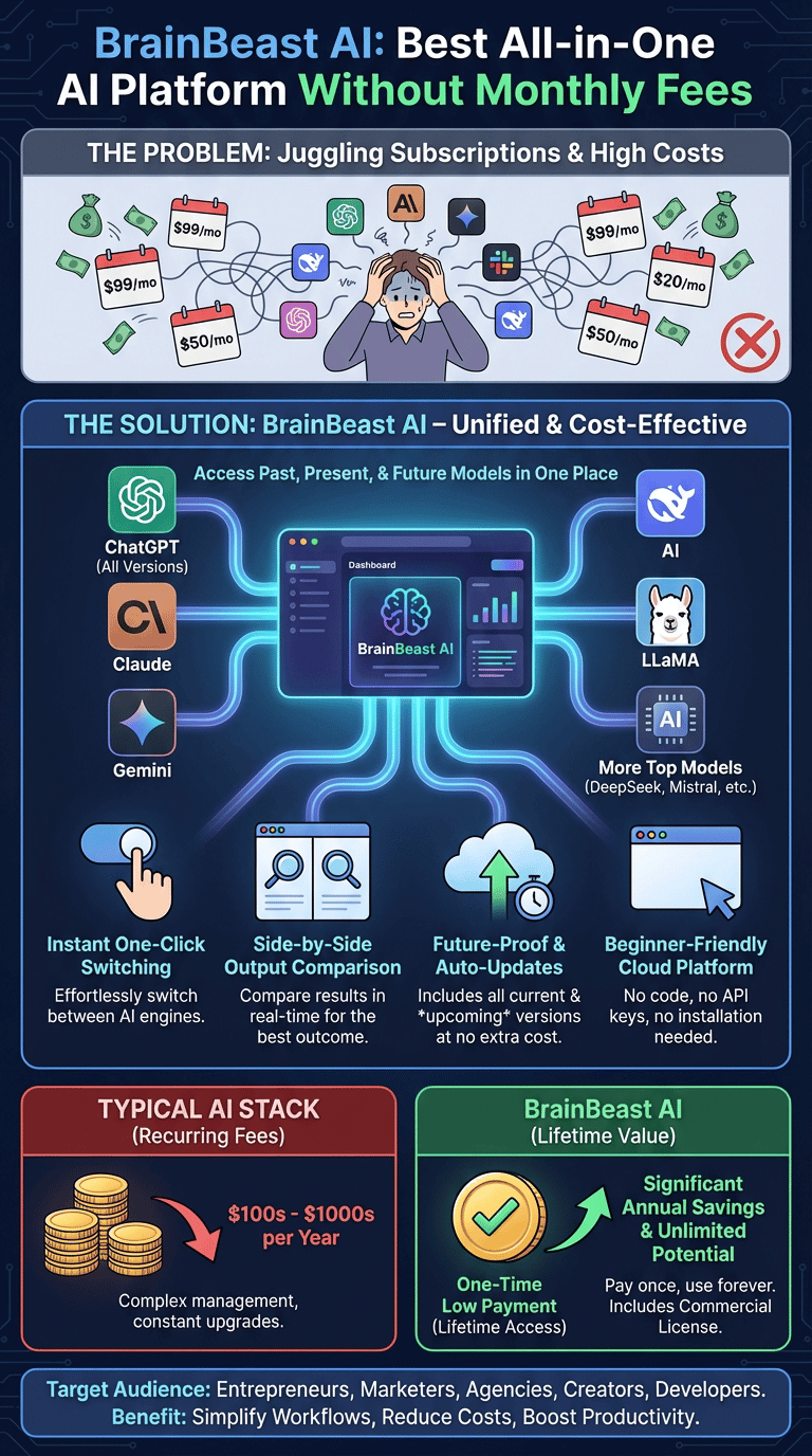 What it is: BrainBeast AI is a unified dashboard granting lifetime access to multiple top AI models with current and future versions included.