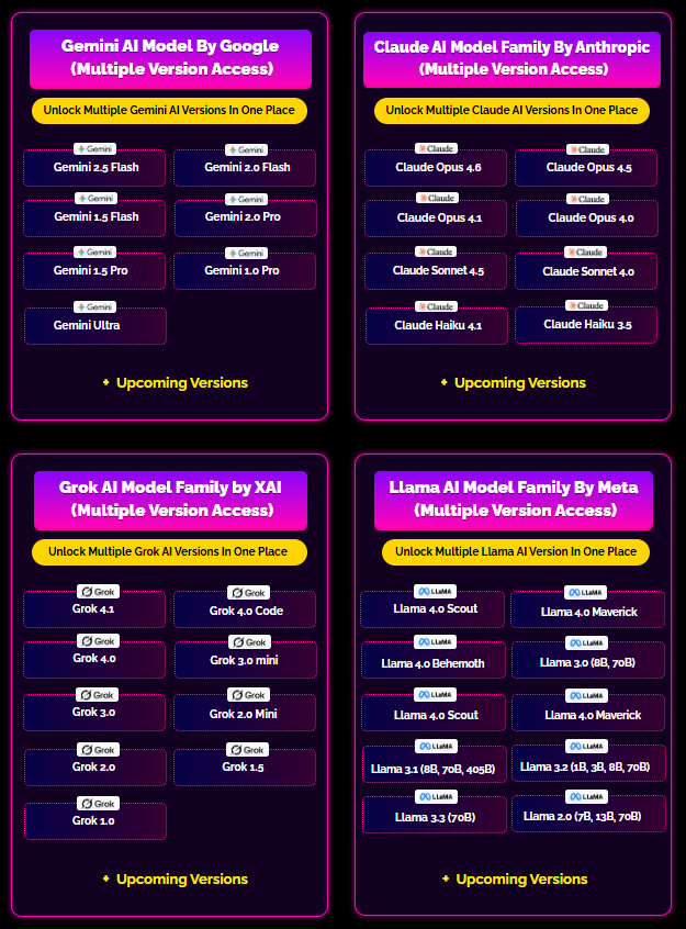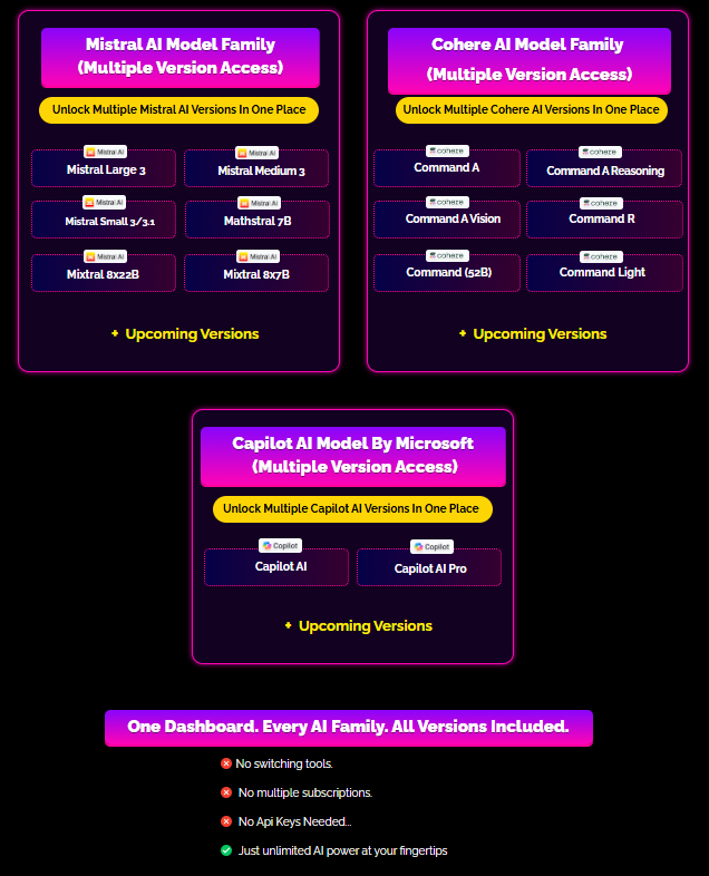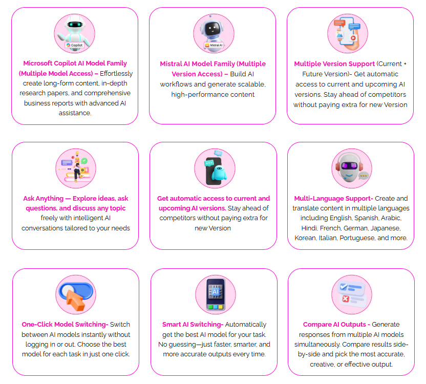 - Access to top AI models: ChatGPT (many versions), DeepSeek, Google Gemini, Claude, Grok, LLaMA, Mistral, Cohere, Microsoft Copilot, Capilot, and more.