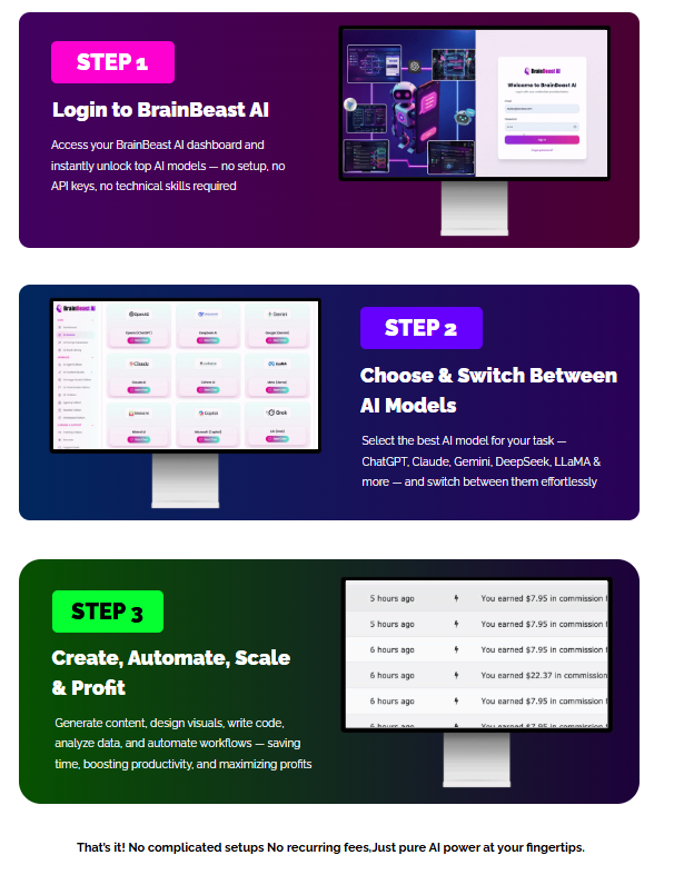 - Step 1: Setup – Simply sign in to the BrainBeast AI dashboard without the need for API keys or complicated installation. The cloud-based system requires no technical skills.