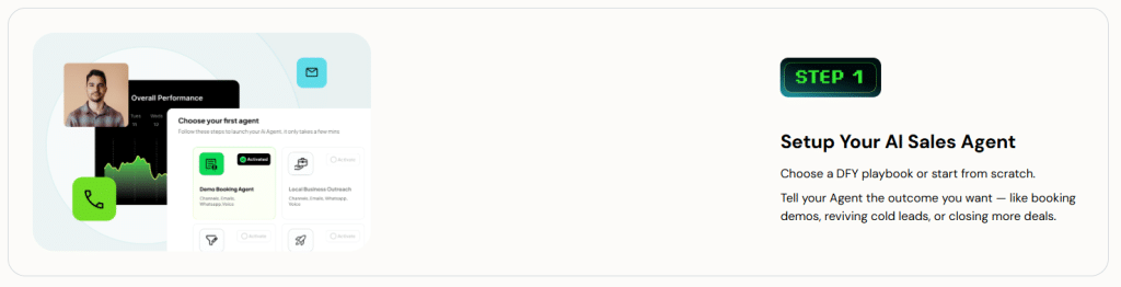 Choose a done-for-you sales playbook or build a custom AI sales agent to reflect your business goals, whether it’s booking demos, reactivating cold leads, or closing sales.