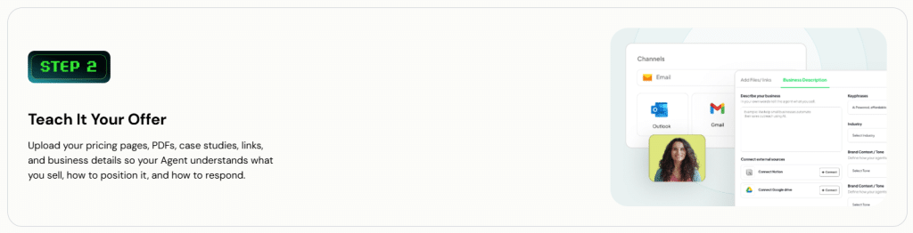 Upload your business information like pricing pages, case studies, and product details. The AI agent then auto-prospects based on your targeting rules, nurtures inbound and outbound leads, handles objections via natural voice calls, sends dynamic proposals, and books meetings—all automatically.