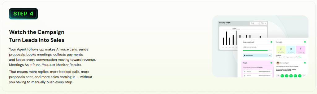 - Multichannel outreach including email, WhatsApp, SMS, and AI voice calls that sound natural and handle objections.