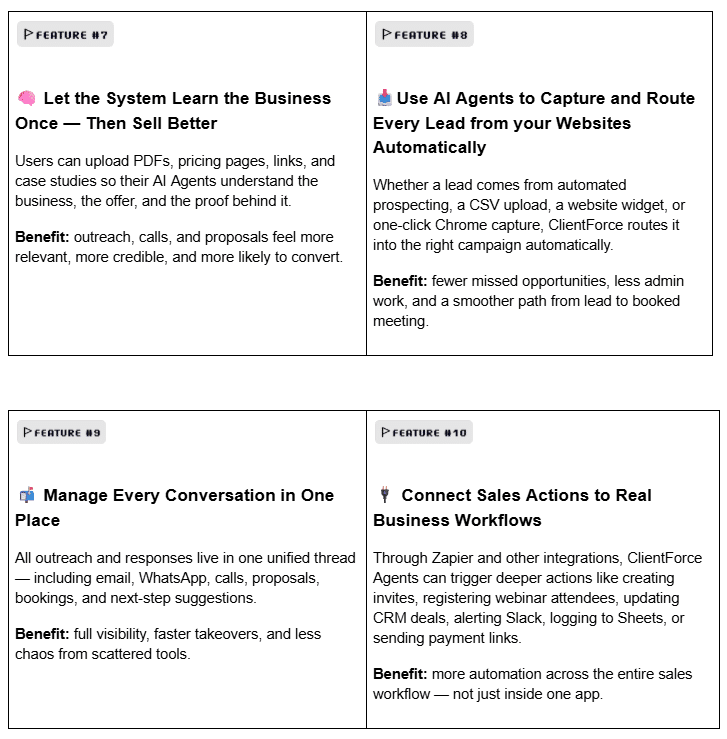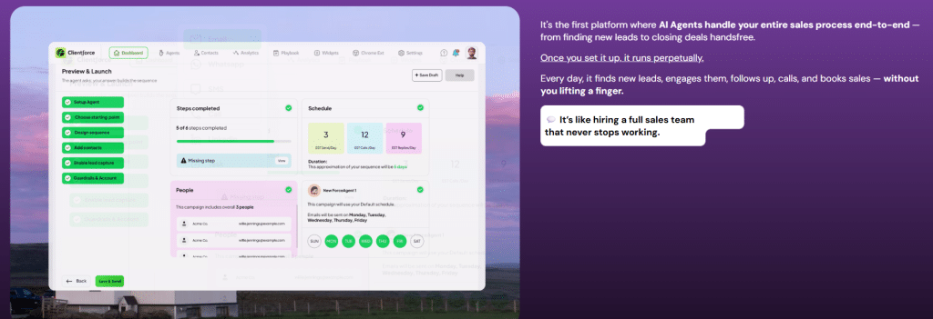 Unlike traditional sales CRMs and automation platforms that require stitching together multiple tools and manual input, ClientforceAI runs the entire sales process autonomously. Many tools focus on partial automation like email sequences or lead capture, but Clientforce combines: