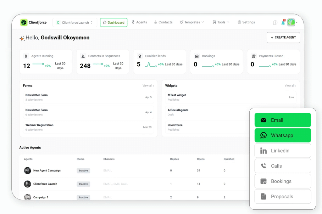 ClientforceAI supports calendar sync, telephony, CRM APIs, Zapier/webhooks, and payment processors. - What channels does it support for outreach?