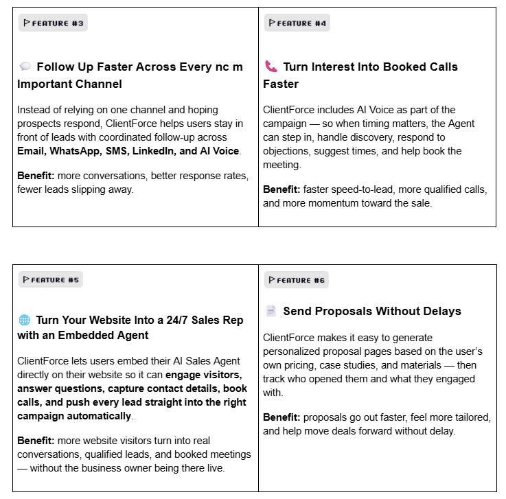 Unlike other automated tools I have used, ClientforceAI integrates so many elements under one roof—lead finding, outreach across multiple channels, proposals, and payment collection. This “one-stop autonomous sales force” approach is what really separates it from the pack and reduces overhead dramatically.