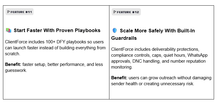 - Compliance & Deliverability Guardrails: Sender rotation, automated warm-up, consent logs, and spam protections ensure clean, effective outreach at scale.
