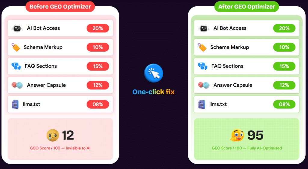 What it is: GEO Optimizer is a powerful WordPress plugin that fully optimizes your site for AI search engines by automatically adding FAQs, structured schema, answer capsules, and AI crawler access.
