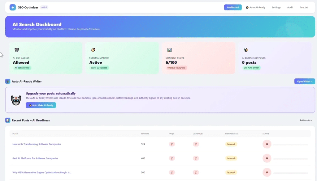 GEO Optimizer offers an all-in-one dashboard to manage AI crawler access, inject essential JSON-LD schema, create AI-extractable answer capsules, auto-generate FAQ sections, and maintain an llms.txt file for crawler priority. The plugin also includes an Auto AI-Ready Writer powered by Claude AI to rewrite posts with proper headings, FAQs, and authority signals automatically.