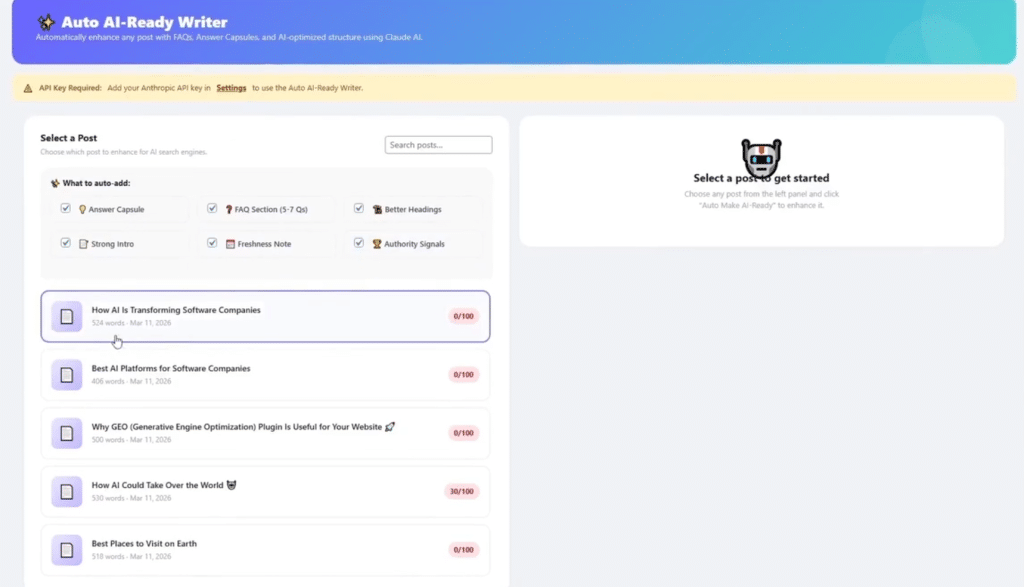 - Auto AI-Ready Writer: Powered by Claude AI, this feature rewrites your posts to be AI-friendly by adding FAQs, answer capsules, proper headings, and authority cues. It saves hours of manual editing.