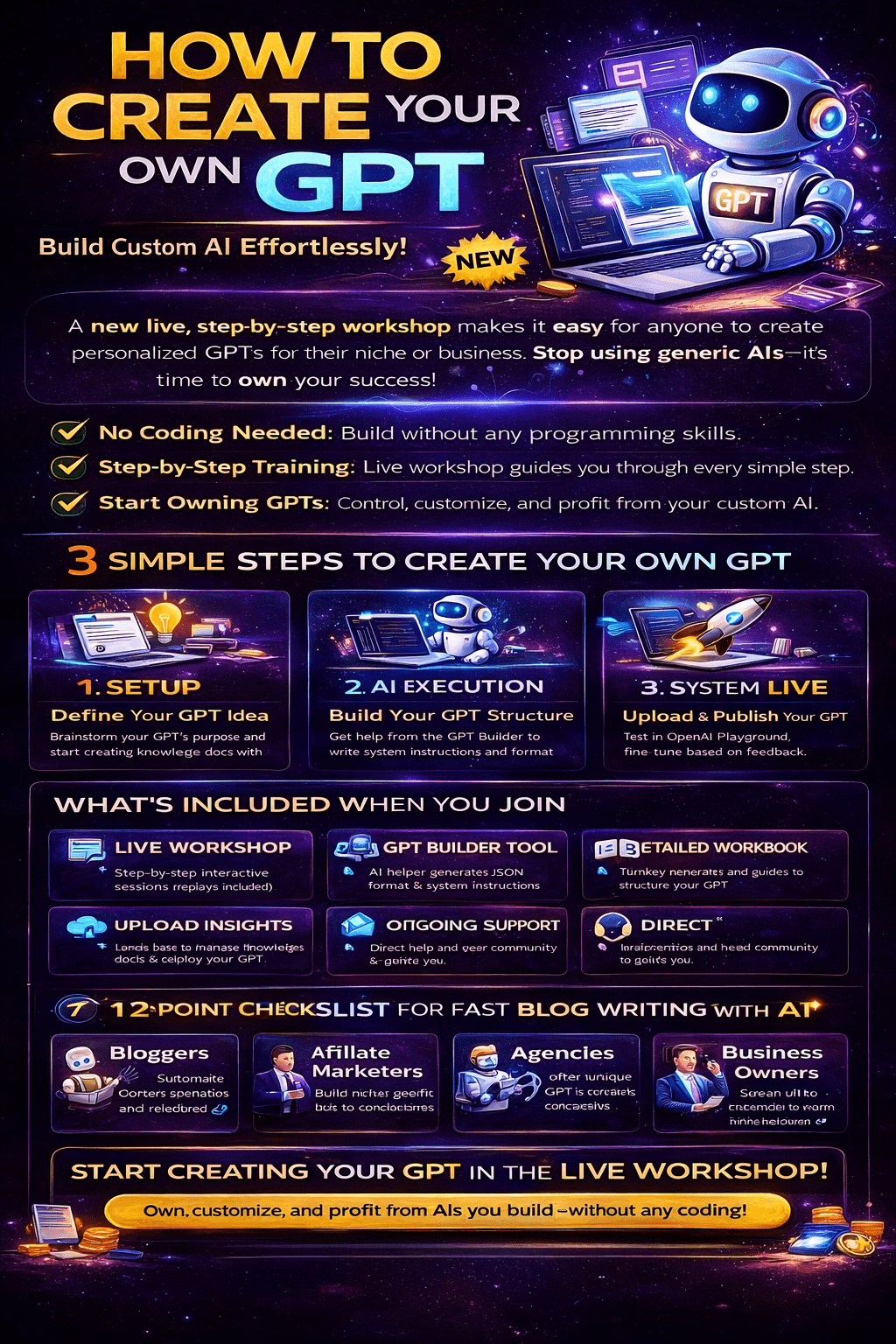 How To Create Your Own GPT is a practical and empowering solution for anyone serious about owning their AI creations. It breaks down barriers to entry in the AI space and arms you with tools and confidence to launch your own custom GPT quickly. Whether you want to automate business processes, enhance content creation, or start a new AI-powered venture, this workshop provides a hands-on roadmap that delivers real results.