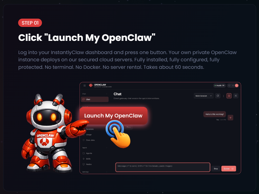 InstantlyClaw is a cloud-hosted platform that provides a fully operational OpenClaw AI agent system pre-installed with multiple skills and autonomous internal workflows. It replaces the traditional OpenClaw setup process with a one-click cloud deployment that comes secured, configured, and ready to perform tasks without any additional technical steps.