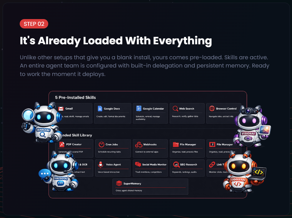 - 15 pre-installed skills (Gmail, Google Docs/Sheets, Browser Control, Web Search, SEO Research, Social Media Monitor, PDF Creator, Cron Jobs, Webhooks, Google Calendar, File Manager, Screenshot/OCR, Voice Agent, Link Tracker, SuperMemory)