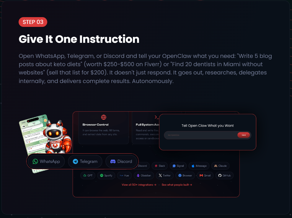 Connect your preferred messaging app (WhatsApp, Telegram, or Discord) and send your OpenClaw a task instruction. The AI team autonomously plans and breaks down the work, delegates tasks among its agents, browses the web, compiles data, and completes deliverables.