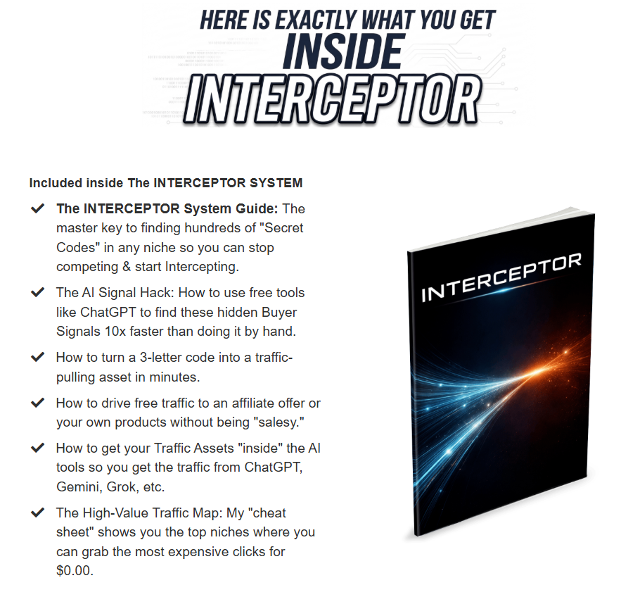 INTERCEPTOR – The Hidden Traffic Hack is a proven system designed to identify and exploit early buyer signals—simple 3 to 5 letter codes potential customers search for before making a purchase decision.