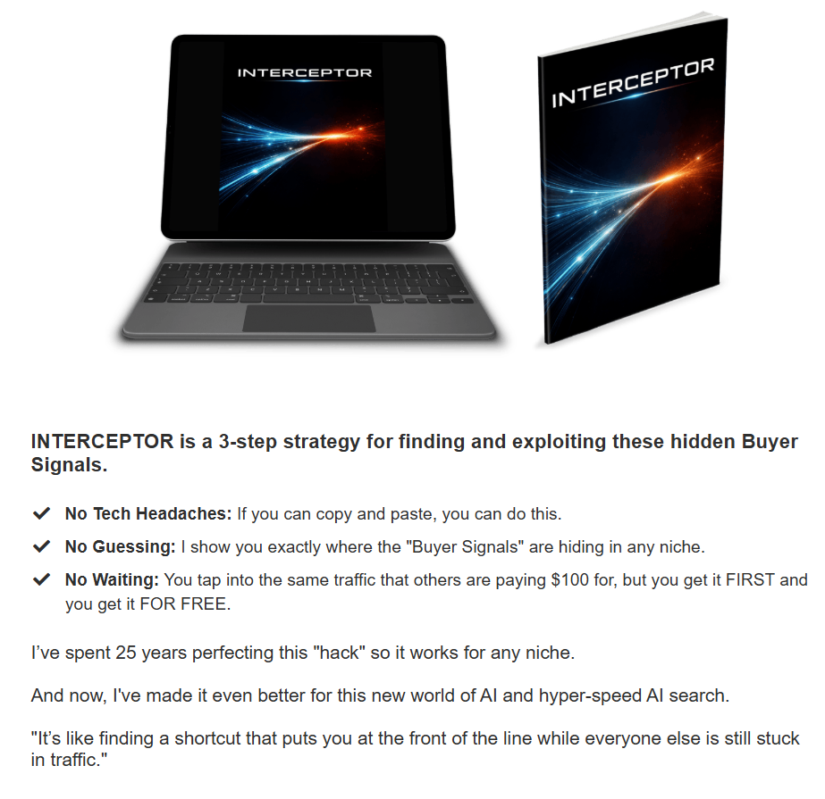 At its core, INTERCEPTOR is a 3-step traffic strategy that uncovers and leverages “buyer signals” — specific shorthand searches buyers perform during their early research phase in any niche.