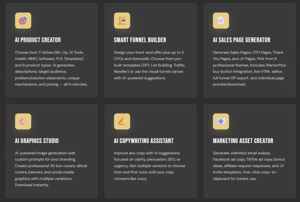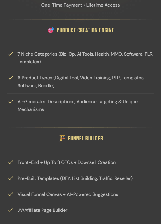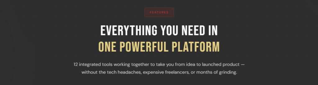 - All-in-one platform: Combines product creation, funnel development, sales pages, graphics, and marketing assets in one place.