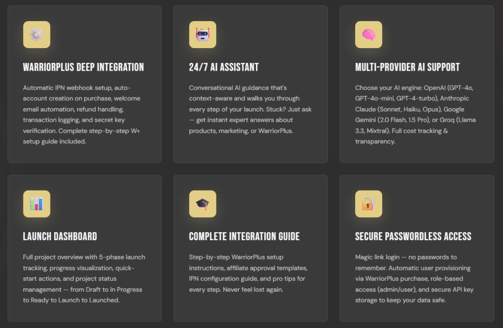 A conversational AI is on-call anytime to answer questions about your toolkit, launch strategy, and WarriorPlus specifics — a helpful guide that reduces frustration and speeds decision-making.