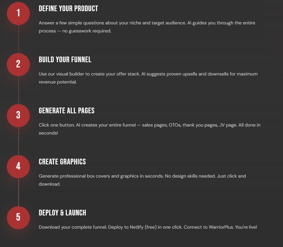 The conventional approach to launching a WarriorPlus product involves multiple steps that often require distinct skills—copywriting, graphic design, funnel setup, and technical integrations. Usually, this means using a patchwork of software, hiring costly experts, or spending months learning the skills yourself.