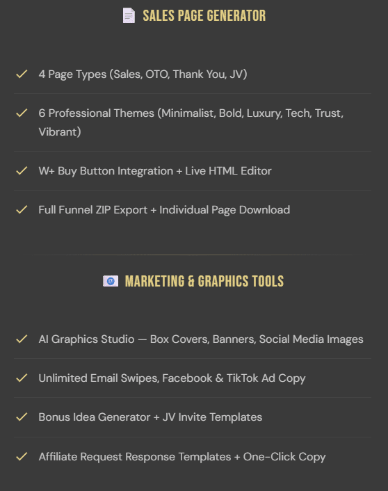 - Complete AI automation covering product creation, sales pages, graphics, and marketing.