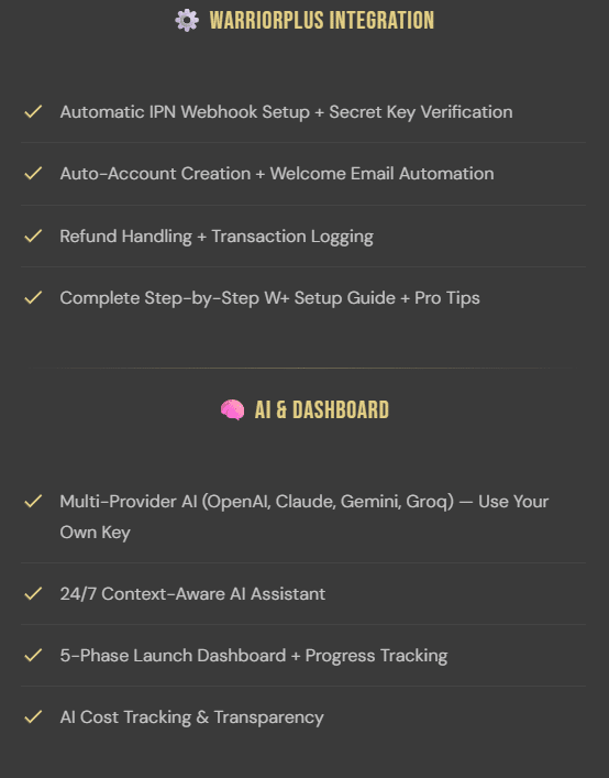 - Complete WarriorPlus deep integration (IPN webhook, auto-account creation, transaction logging).