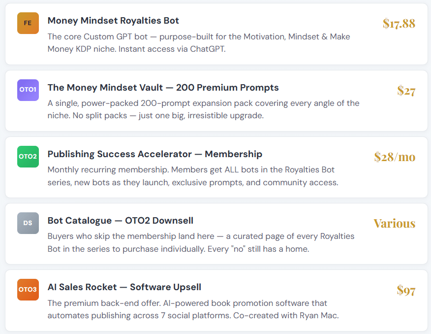 - What it is: A custom AI-powered KDP publishing system focused on the money mindset niche, designed to generate full books optimized for Amazon buyers.