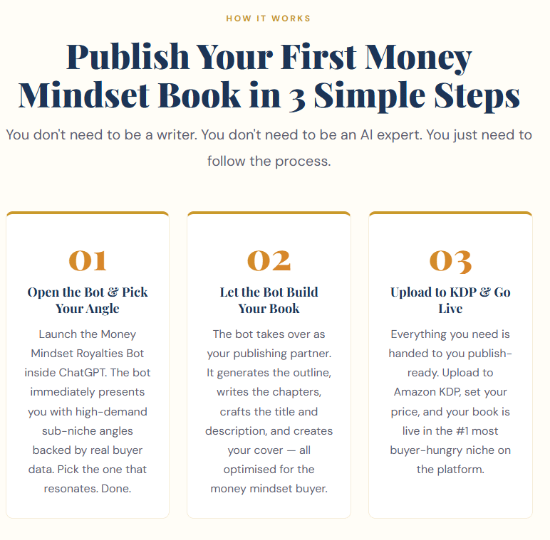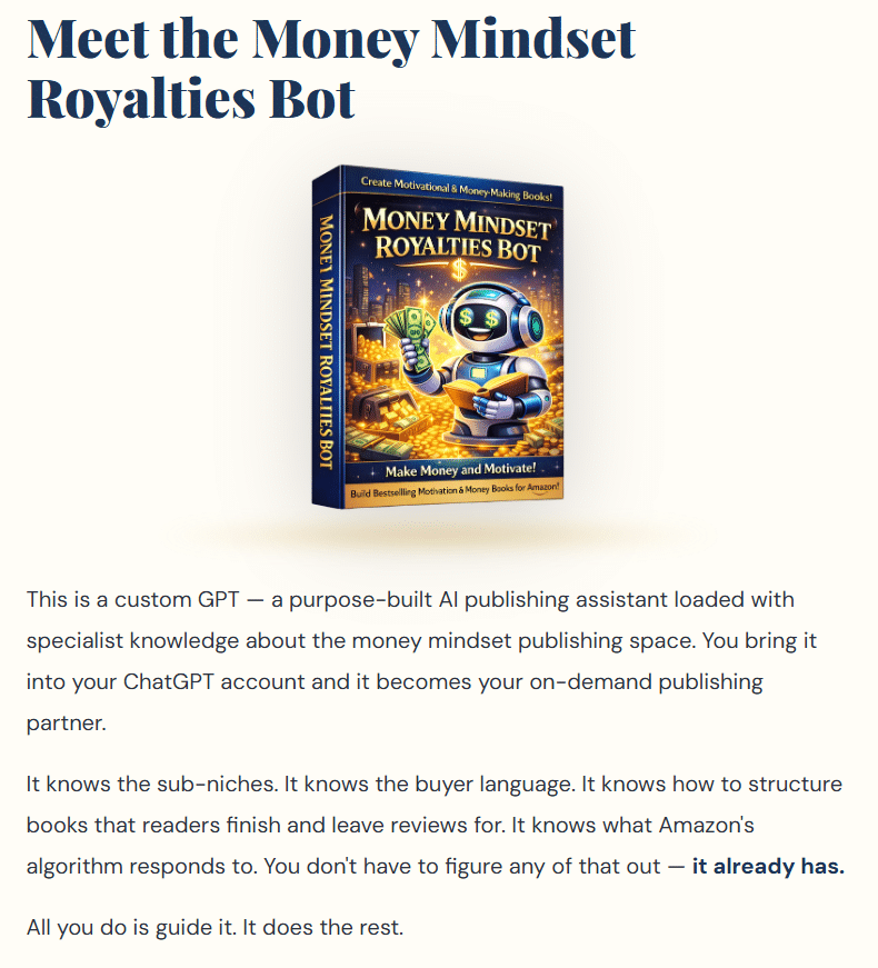 The Money Mindset Royalties Bot offers a focused, expert-backed AI publishing solution in a highly valuable and evergreen niche. It simplifies complex workflows, delivers publish-ready books optimized for Amazon, and creates a repeatable process that can multiply your passive income streams steadily.