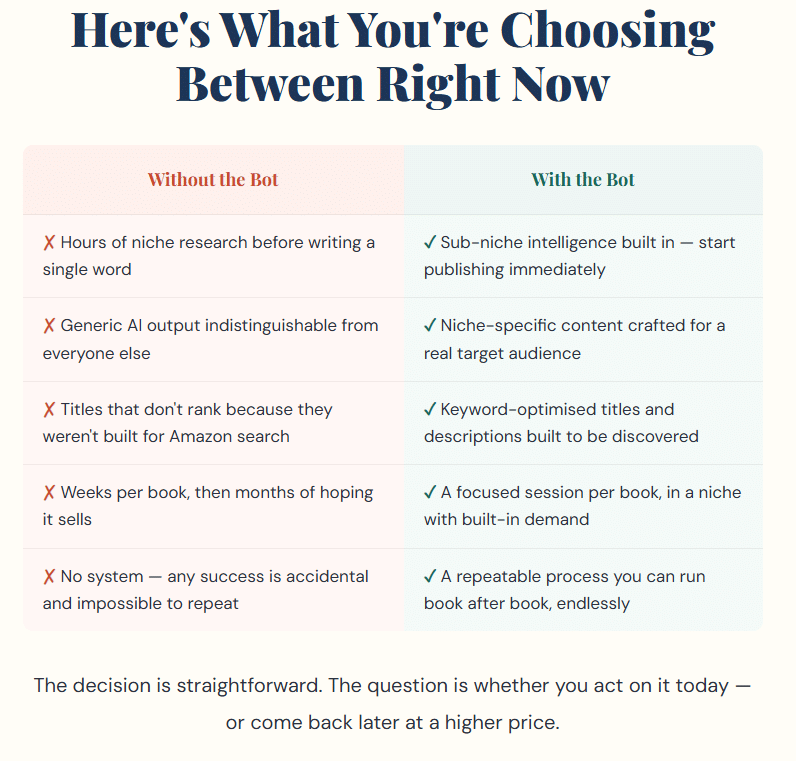 With minimal upfront cost and work proportional to your output, this bot is an excellent tool for anyone serious about succeeding on Amazon KDP in 2026 and beyond.