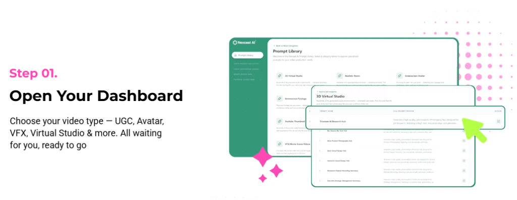 NexCast flips this model by providing pre-built, fully optimized prompts that communicate directly with AI video engines. This automation eliminates guesswork and manual scripting, speeding up production while maintaining professional quality.