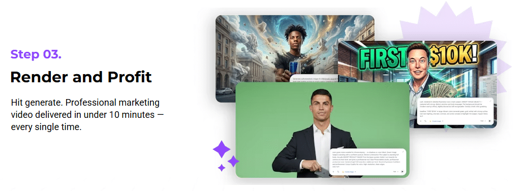 In under 10 minutes, the AI generates a professional, high-quality video ready for upload, sharing, or client delivery. The system produces polished animations, cinematic effects, and scroll-stopping visuals without extra effort.