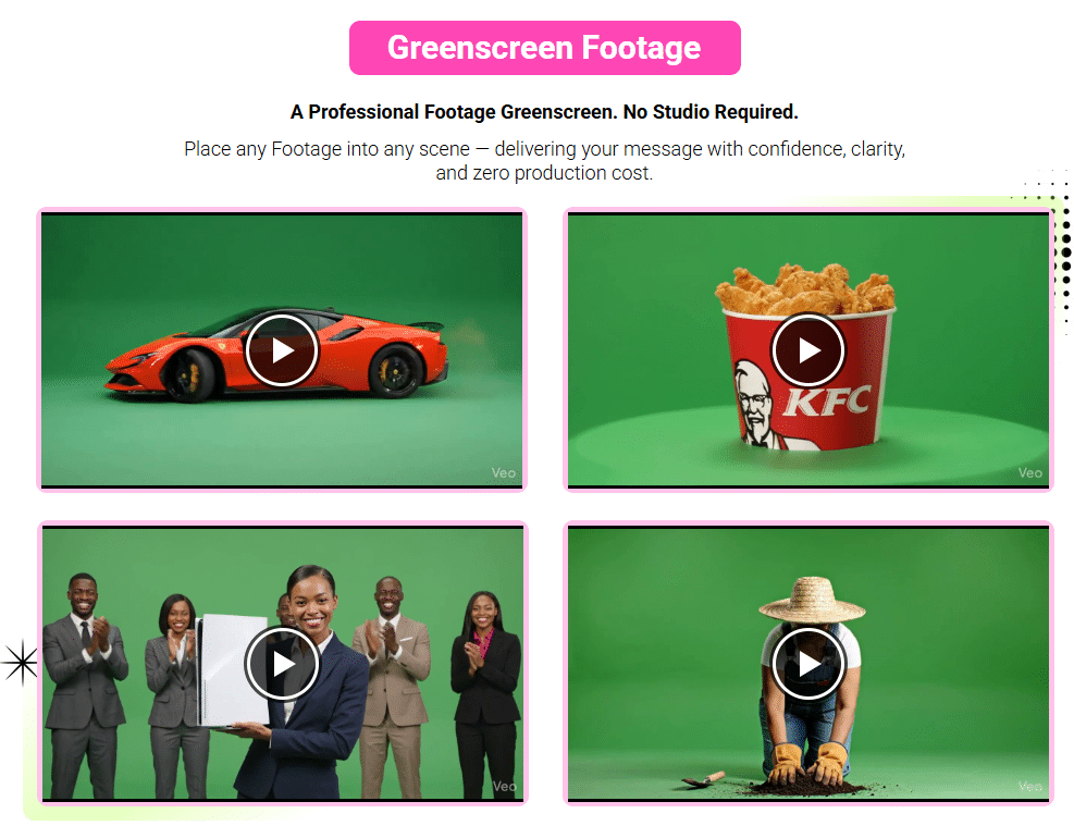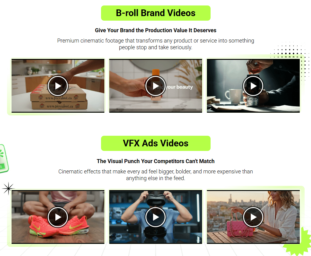The system covers a broad range of video types, including UGC (user-generated content), VFX ads, green screen avatars, animated videos, virtual studios, and YouTube thumbnails.