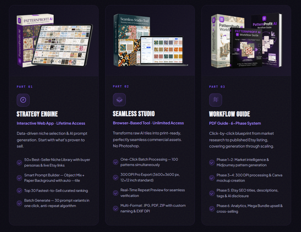 PatternProfit AI is a browser-based application and comprehensive system designed to produce “bestseller-grade” seamless digital patterns quickly and reliably. It combines AI-powered image generation with niche market intelligence, advanced batch processing tools, and a step-by-step Etsy selling blueprint.