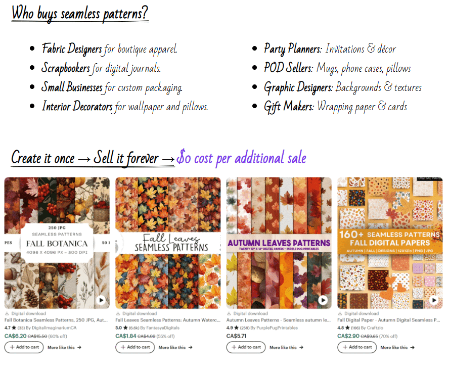 The ROI potential is substantial as well: selling just a few pattern collections on Etsy could quickly recoup your investment with zero ongoing fees or inventory costs.