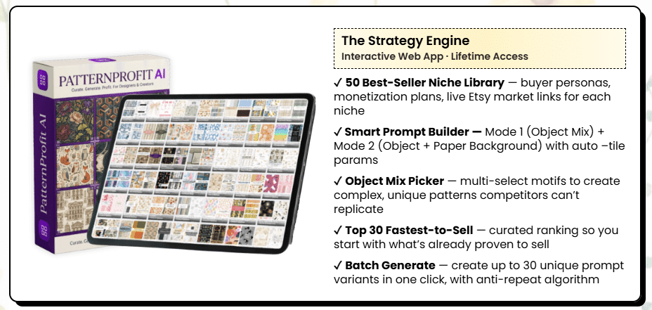 Ready to start your seamless pattern empire and unlock effortless digital design profits? Grab PatternProfit AI today and use code PATTERN5 to save $5 while the limited spots last!