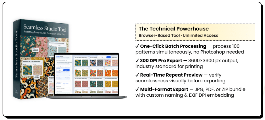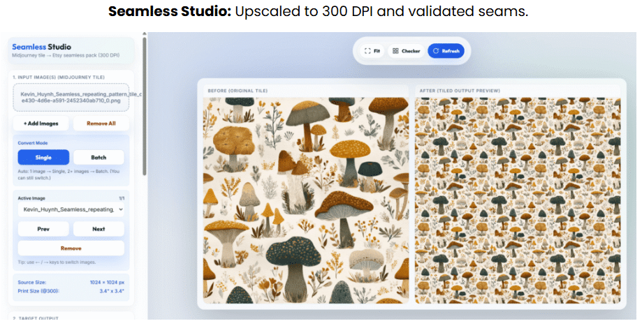 Upload your AI-generated tiles to the Seamless Studio tool for batch processing. This tool upscales your designs to 300 DPI at 12×12 inches, verifies seamless repeat quality with real-time previews, and exports print-ready files in various formats, complete with naming and metadata for Etsy listing.